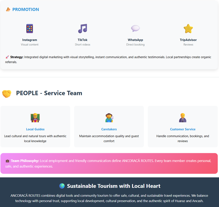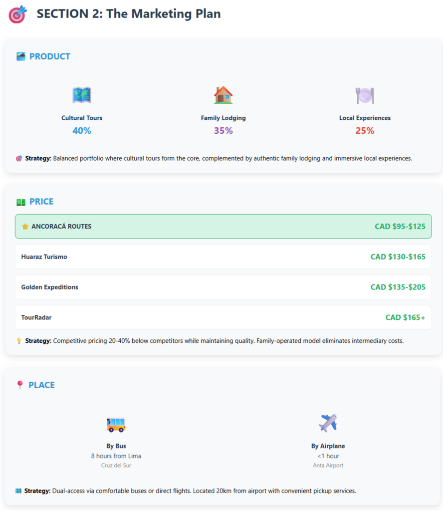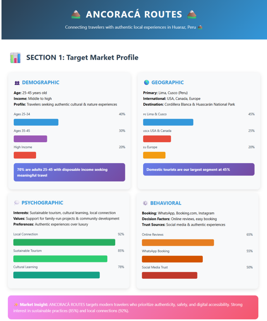 This infographic shows the marketing plan for ANCORACÁ ROUTES, a small tourism project from Ancash, Peru. It explains the target market and the 4Ps of marketing: product, price, place, promotion, and people. The information helps to understand who the tourists are, what they like, and how the company can promote its cultural and nature tours. Each part includes real data and sources that connect with my previous Industry and Operations Plans.